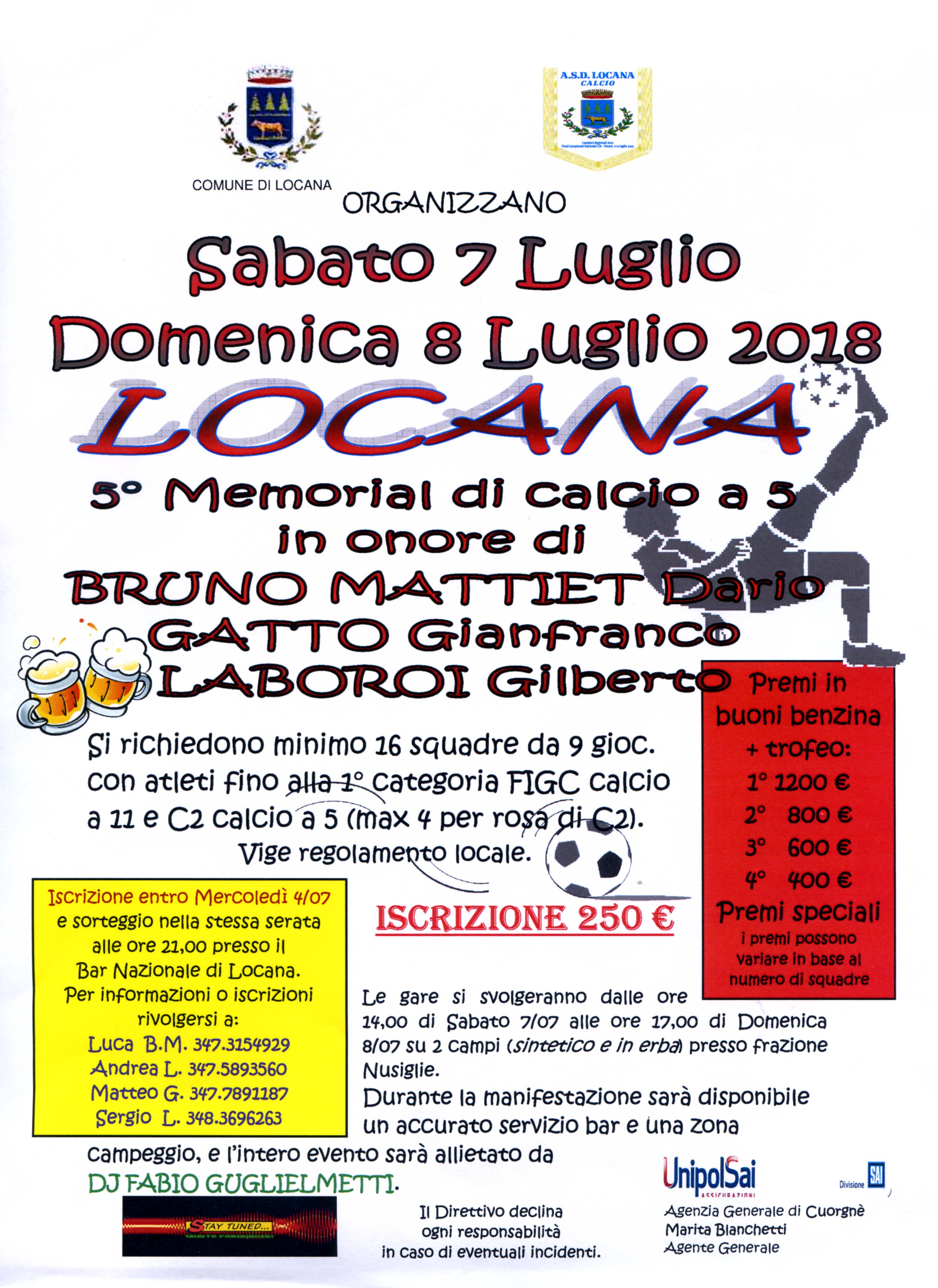 Le gare si svolgeranno dalle ore 14.00 di sabato 7/07 alle ore 17.00 di domenica 8/07 su 2 campi (sintetico e in erba) presso frazione Nusiglie.