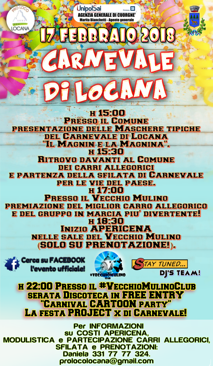 h. 17.00 Presso il Vecchio Mulino - Premiazione del miglior carro allegorico e del gruppo in marcia più divertente!