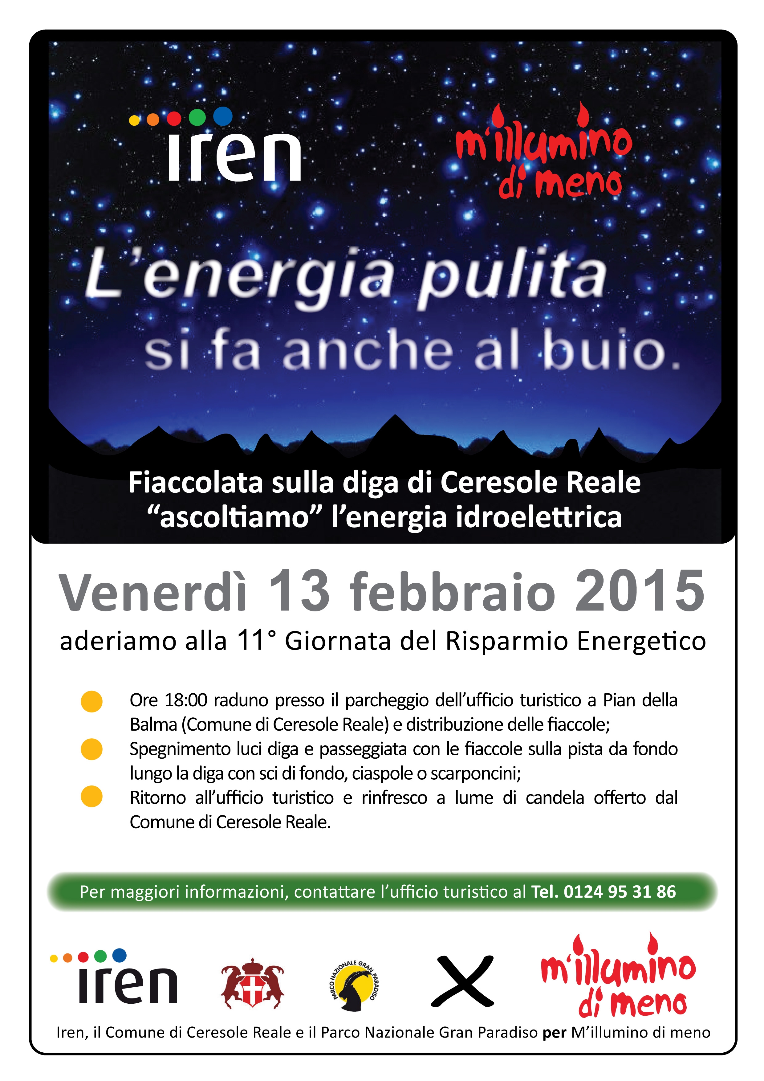Venerdì 13 febbraio a Ceresole Reale, nel versante piemontese del Parco, Iren in collaborazione con l'Ente Parco e il comune di Ceresole Reale aderirà all'iniziativa "M'illumino di meno", promossa dal programma di RAI Radiodue "Caterpillar".