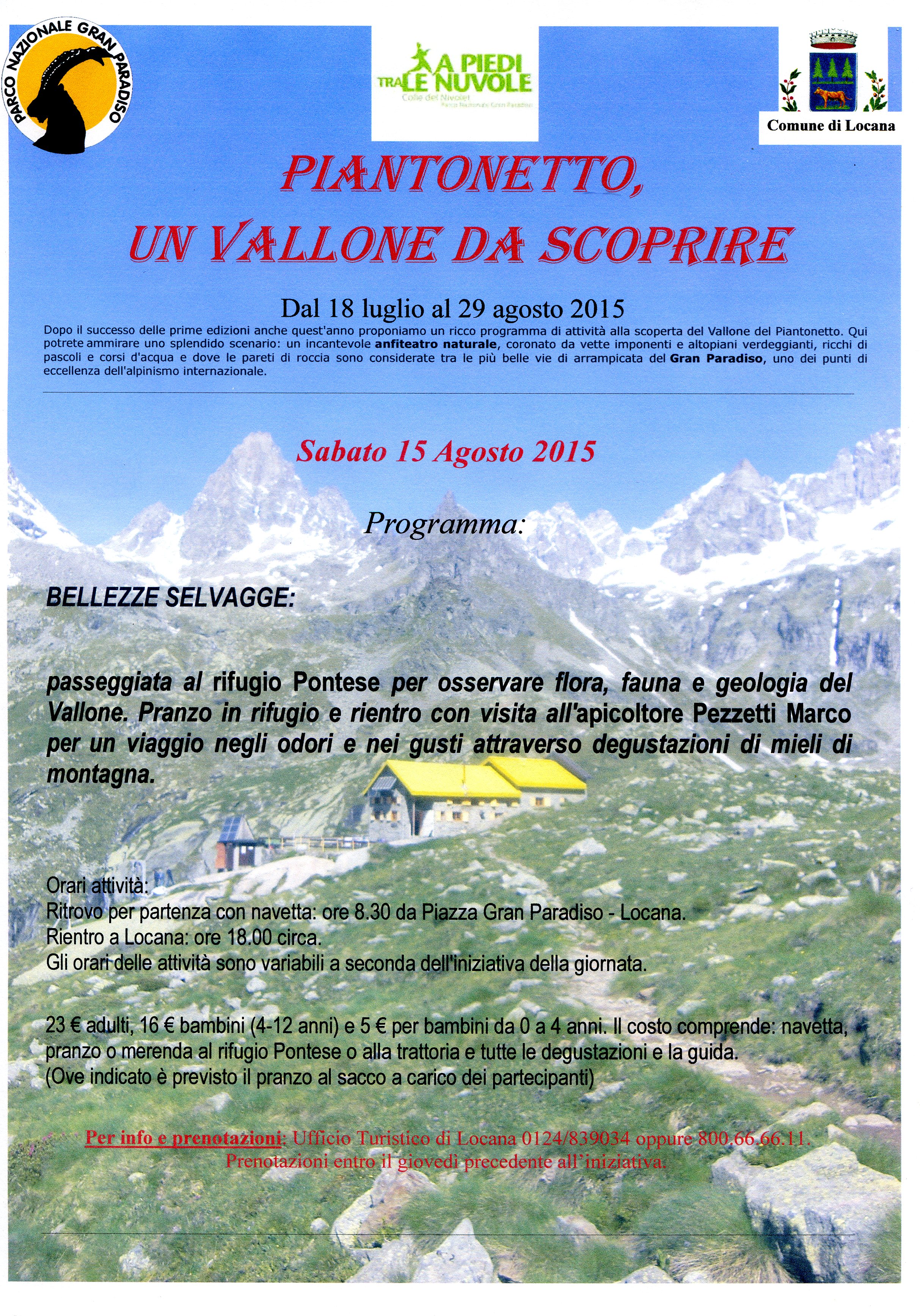 Anche quest'anno proponiamo un ricco programma di attività organizzato con la Pro loco e il Comune di Locana, che vi porterà i sabato di luglio e agosto in navetta nel Vallone di Piantonetto per ammirare panorami mozzafiato attraverso escursioni guidate al rifugio Pontese, visite alla diga e attività di conoscenza degli ecosistemi acquatici. Qui potrete ammirare uno splendido scenario: un incantevole anfiteatro naturale, coronato da vette imponenti e altopiani verdeggianti, ricchi di pascoli e corsi d'acqua e dove le pareti di roccia sono considerate tra le più belle vie di arrampicata del Gran Paradiso, uno dei punti di eccellenza dell'alpinismo internazionale.