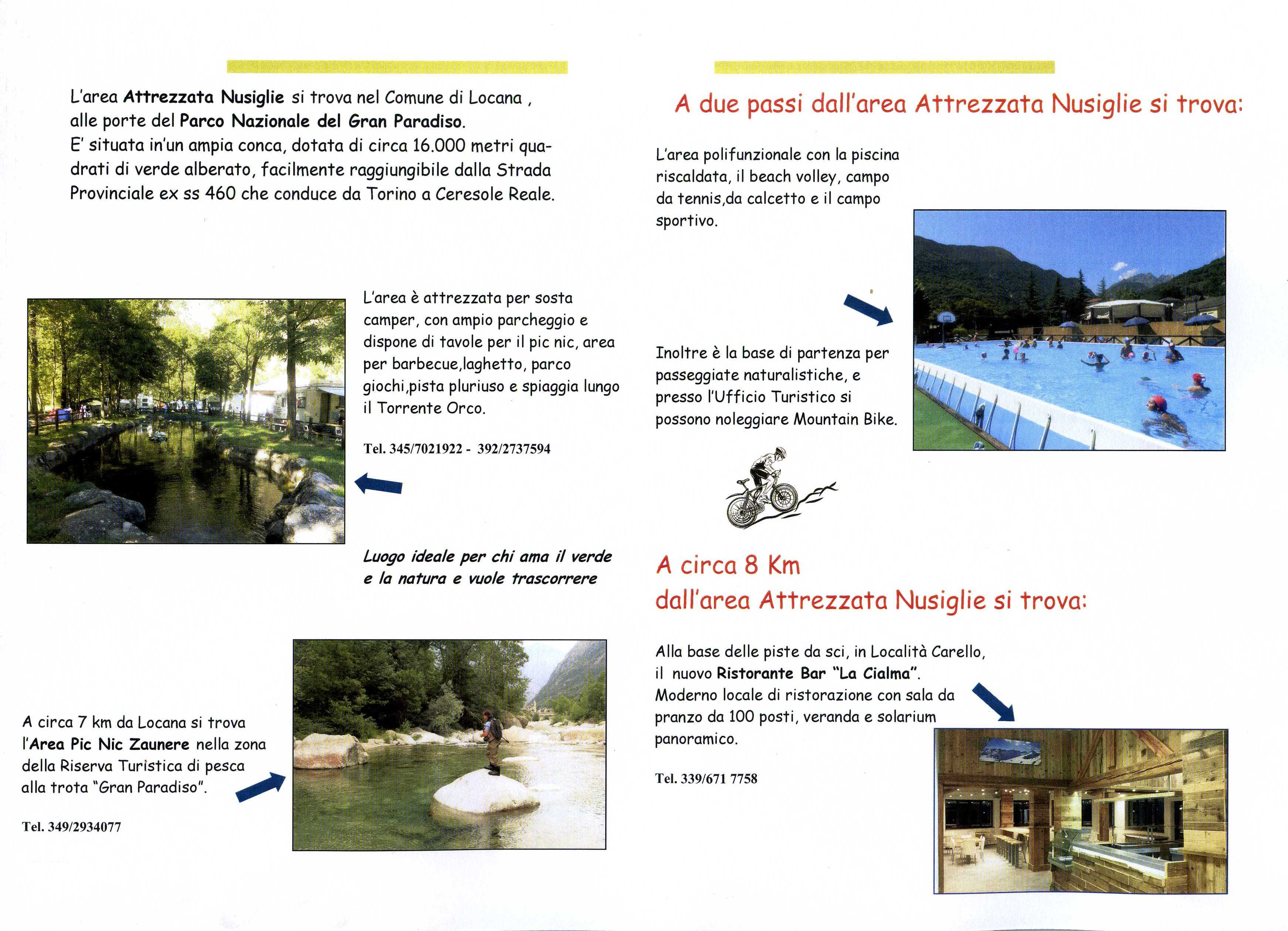L'Area attrezzata Nusiglie si trova nel Comune di Locana, alle porte del Parco Nazionale del Gran Paradiso ed è dotata di circa 16.000 metri quadri di verde alberato, facilmente raggiungibile dalla Strada provinciale ex ss460 che conduce da Torino a Ceresole Reale. Adatta per chi adora viaggiare in camper e per chi cerca ama le vacanze in tenda.