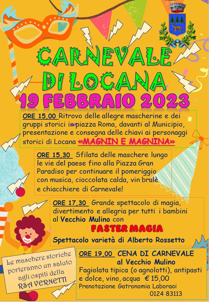 ORE 15.30 Sfilata delle mascherine lungo le vie del paese fino alla Piazza Gran Paradiso per continuare il pomeriggio con musica, cioccolata calda, vin brulè e chiacchiere di Carnevale!