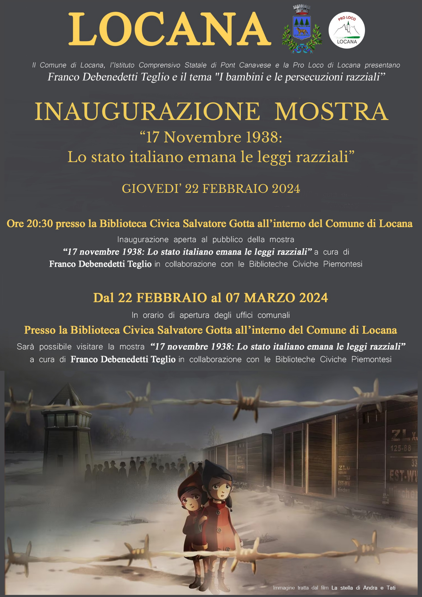 Presso la Biblioteca Civica Salvatore Gotta all'interno del Comune di Locana, sarà possibile visitare la mostra "17 novembre 1938: Lo stato italiano emana le leggi razziali" a cura di Franco Debenedetti Teglio in collaborazione con le Biblioteche Civiche Piemontesi