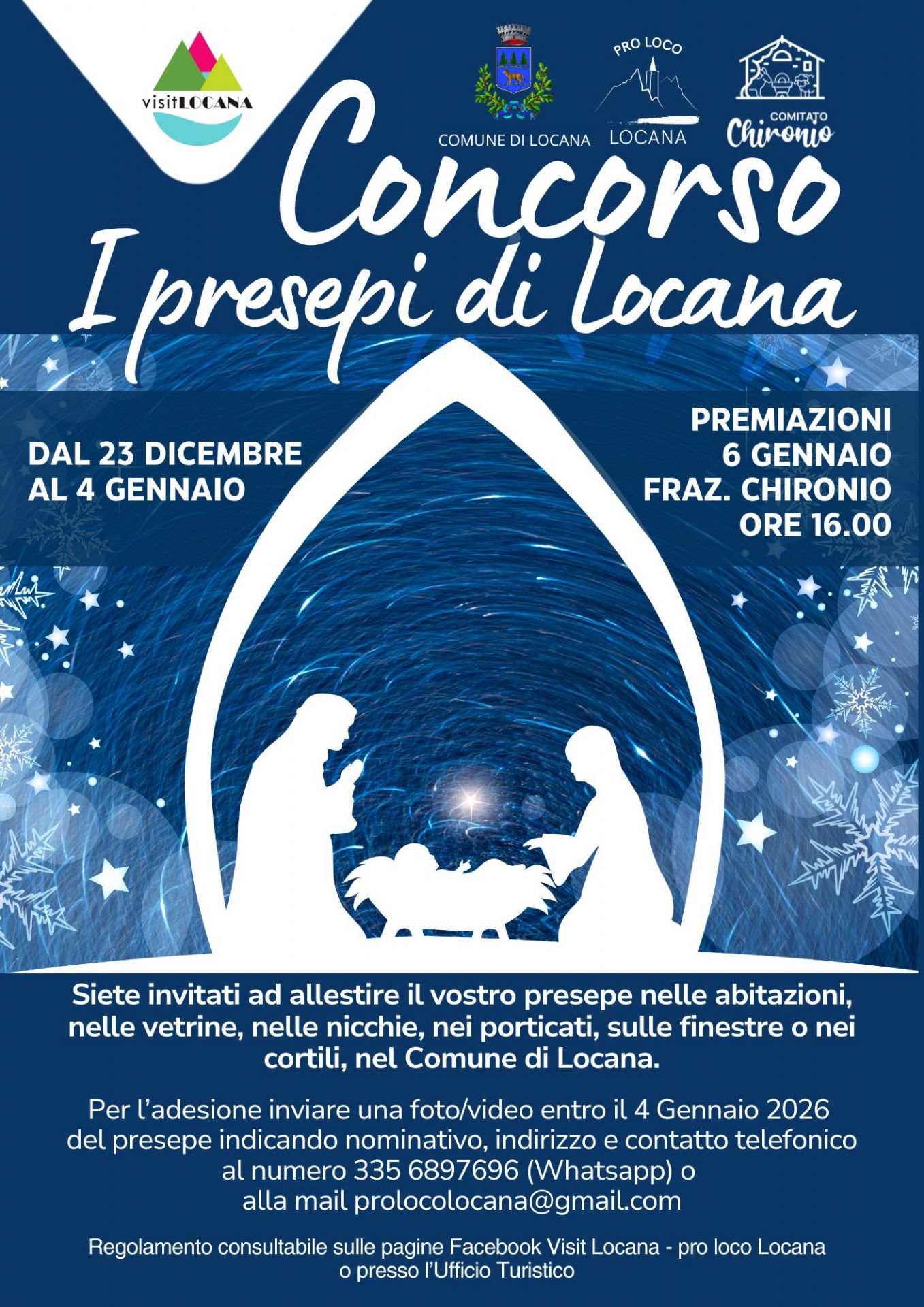 Per l’adesione inviare una foto/video entro il 4 Gennaio 2026 del presepe indicando nominativo, indirizzo e contatto telefonico al numero 335 6897696 (Whatsapp) o alla mail prolocolocana@gmail.com