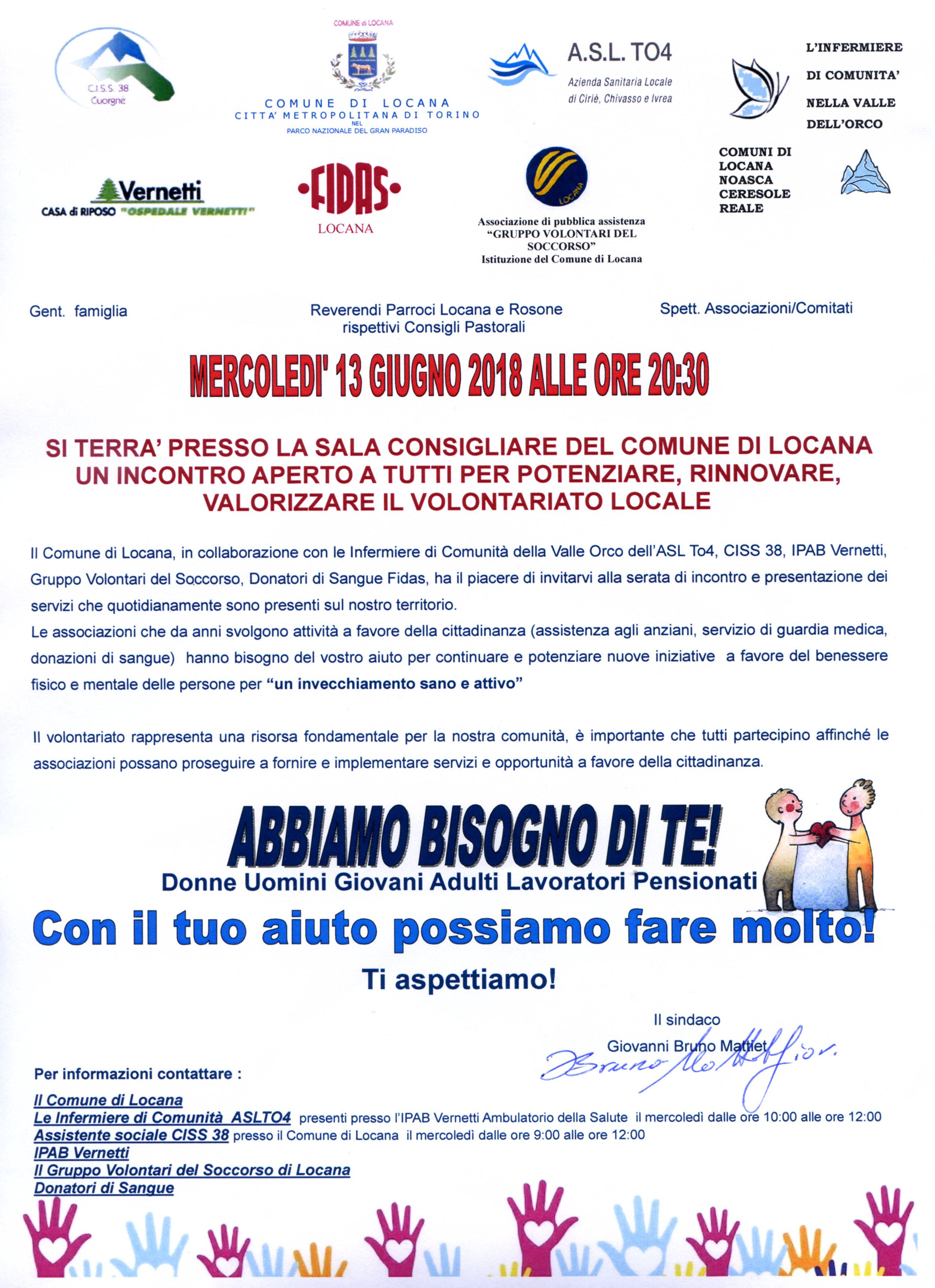 Il Comune di Locana, in collaborazione con le Infermiere di Comunità della Valle Orco dell’ASL To4, CISS 38, IPAB Vernetti, Gruppo Volontari del Soccorso, Donatori di Sangue Fidas, ha il piacere di invitarvi alla serata di incontro e presentazione dei servizi che quotidianamente sono presenti sul nostro territorio.