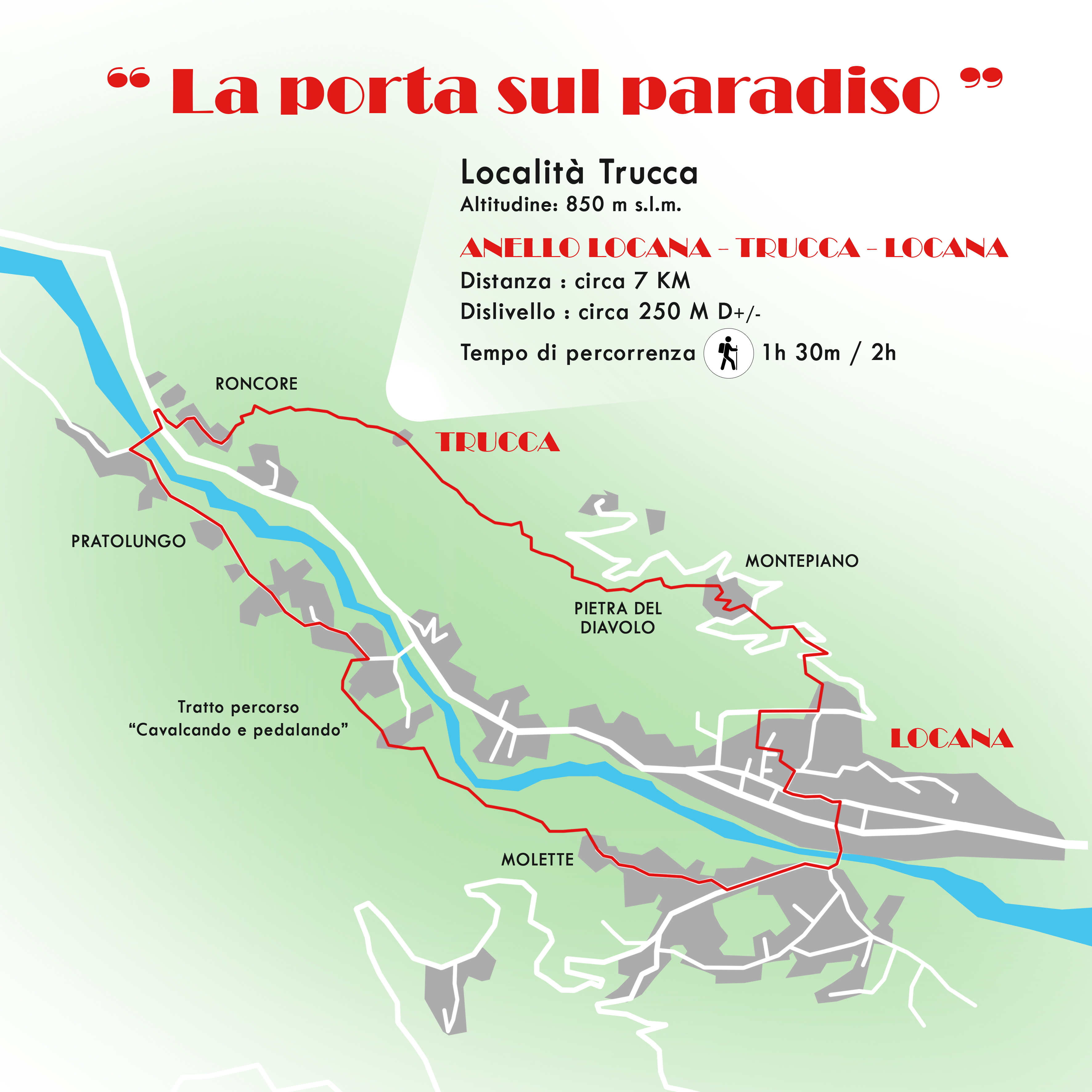 Dal centro storico di Locana, imboccare Via Montepiano fino a raggiungere Località Fontana. Di lì, o proseguire per la strada asfaltata per circa 2 km o imboccare il sentiero ben segnalato (intervallato da tratti su strada asfaltata), fino a raggiungere la graziosa Frazione Montepiano. Proseguire sulla strada asfaltata fino a raggiungere una strada sterrata. Imboccarla e seguirla fino alla Frazione Trucca.