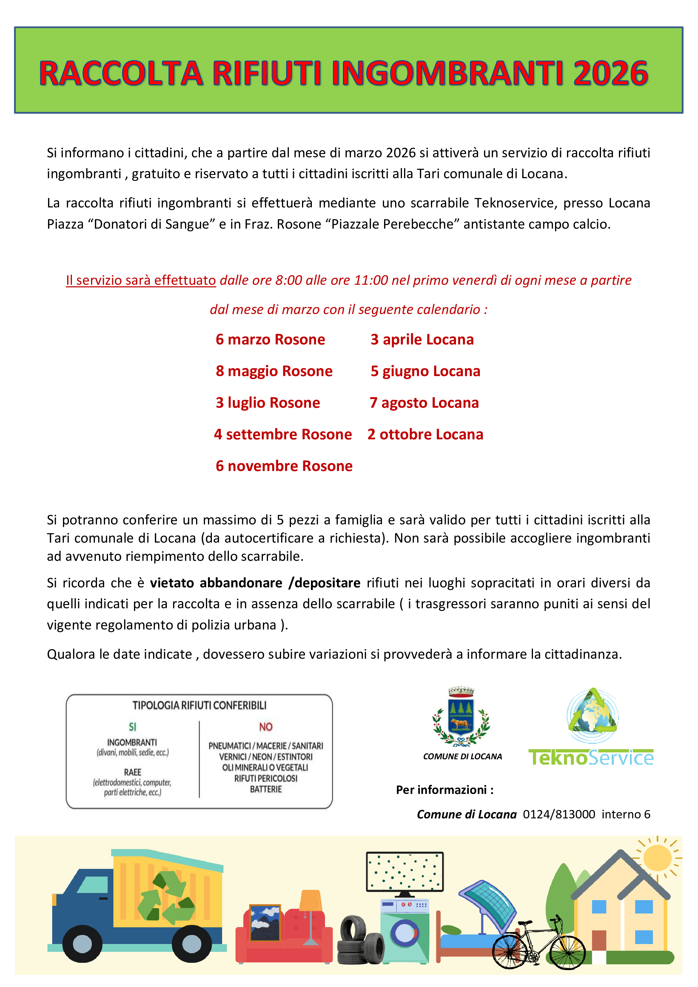 La raccolta rifiuti ingombranti si effettuerà mediante uno scarrabile Teknoservice, presso Locana Piazza “Donatori di Sangue” e in Fraz. Rosone “Piazzale Perebecche” antistante campo calcio.