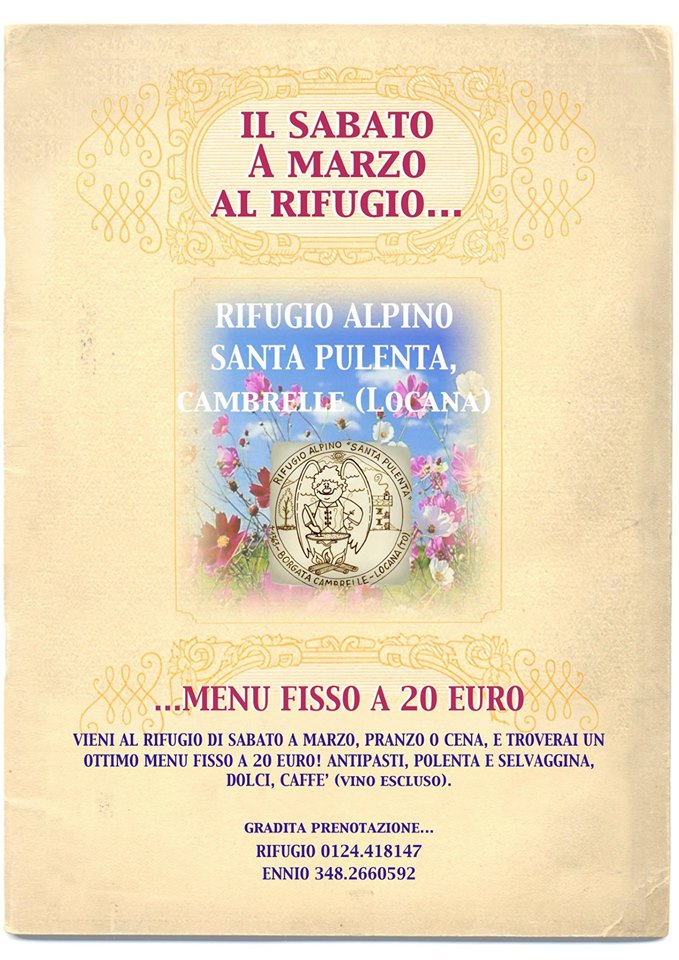 Vieni al rifugio di sabato a Marzo, pranzo o cena, e troverai un ottimo menù fisso a 20 euro! Antipasti, polenta e selvaggina, dolci, caffè (vino escluso).