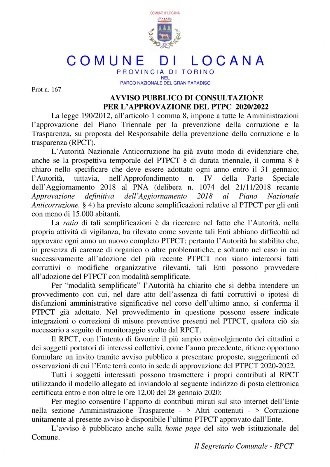AVVISO PUBBLICO DI CONSULTAZIONE PER L'APPROVAZIONE DEL PTPC 2020/2022