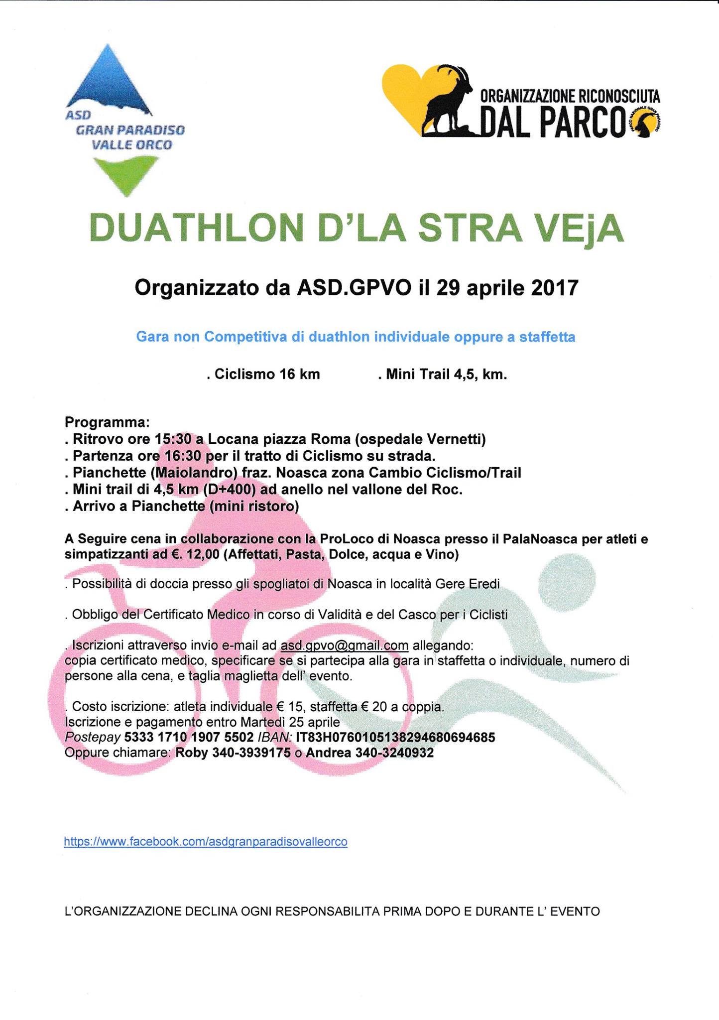 - Ritrovo ore 15.30 a Locana Piazza Roma (ospedale Vernetti)