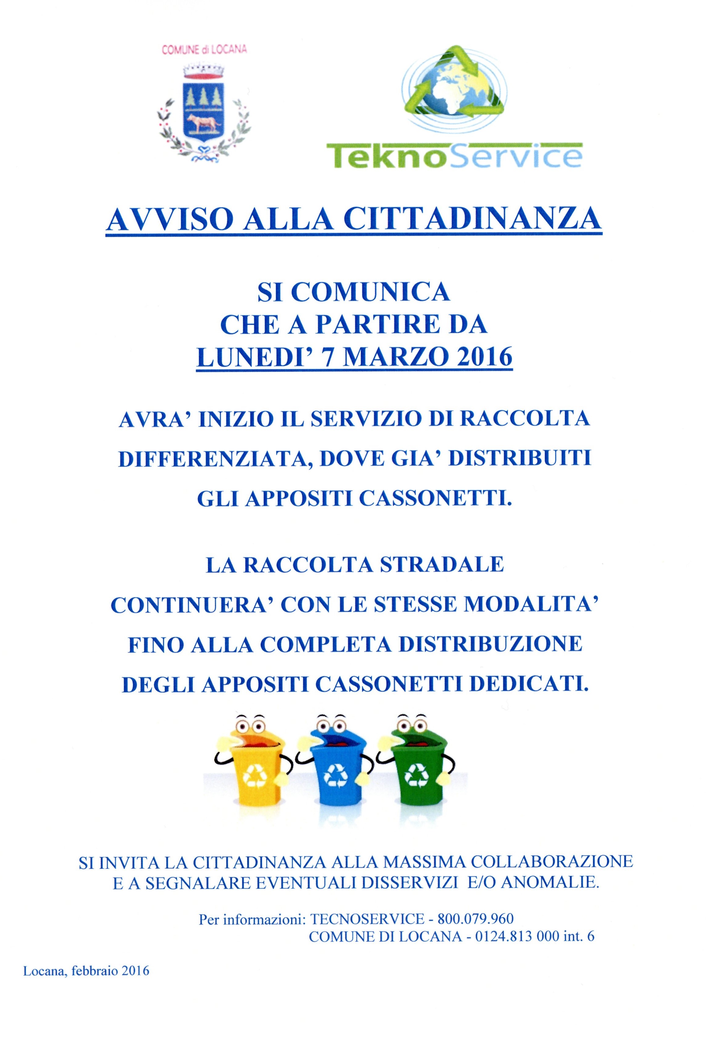 Avrà inizio il Srvizio di raccolta differenziata, dove già distribuiti gli appositi cassonetti.