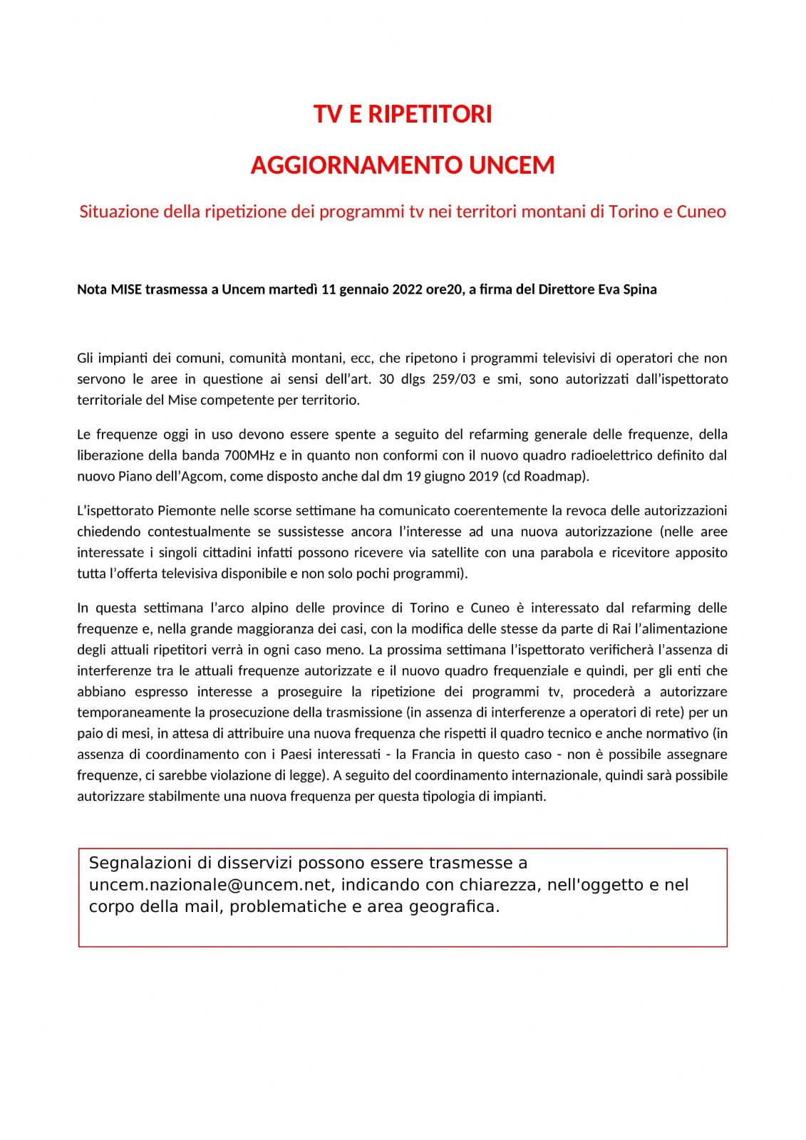 Segnalazioni di disservizi possono essere trasmesse a uncem.nazionale@uncem.net, indicando con chiarezza, nell'oggetto e nel corpo della mail, problematiche e area geografica.