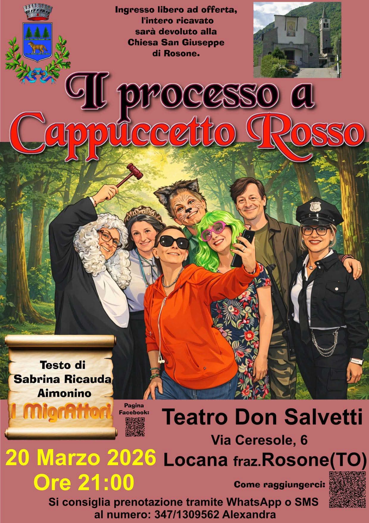 Ore 21.00 – Spettacolo teatrale “Processo a Cappuccetto Rosso” con la compagnia “I Migrattori”.