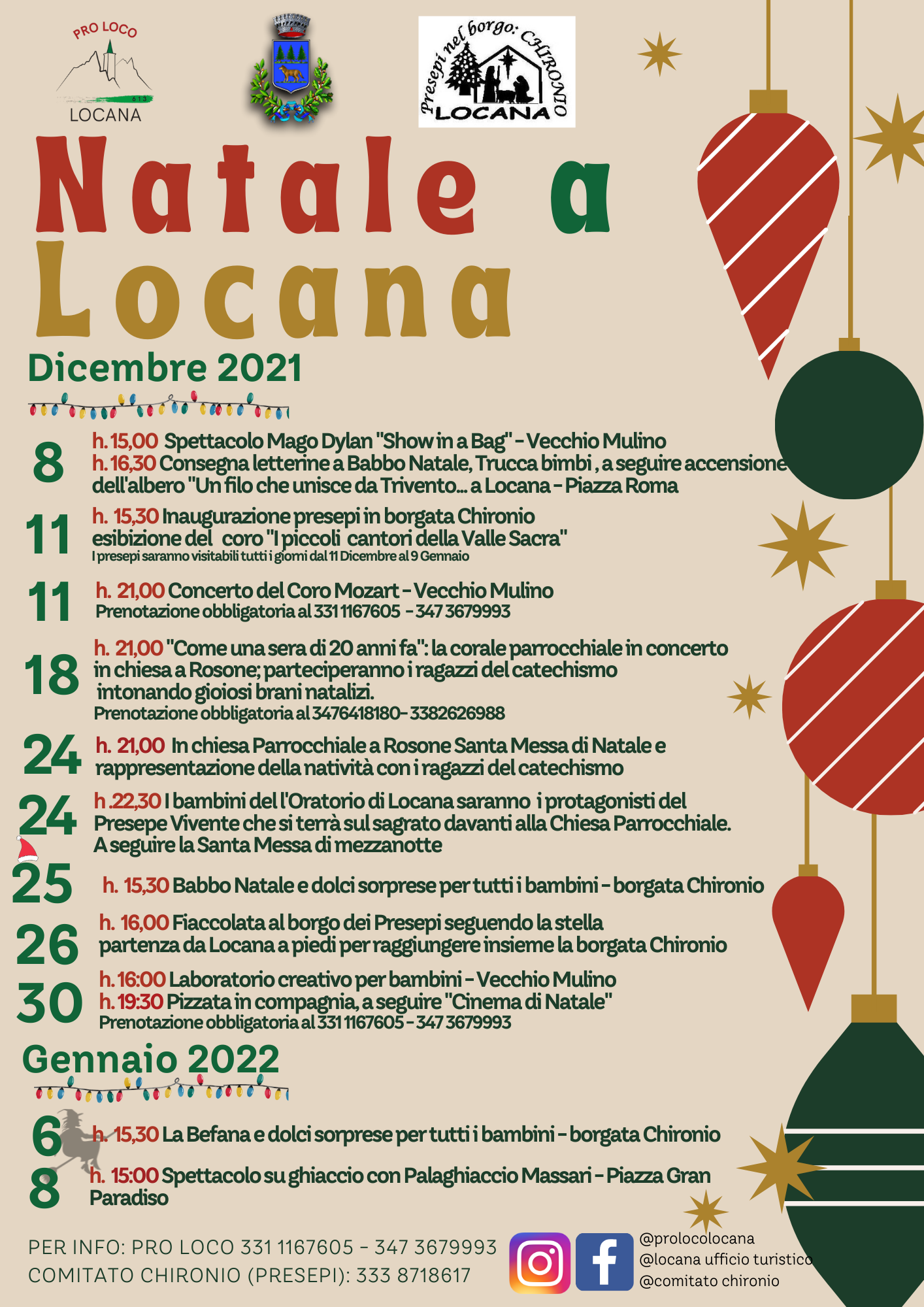 24 Dicembre: h .22,30 I bambini del l'Oratorio di Locana saranno i protagonisti del Presepe Vivente che si terrà sul sagrato davanti alla Chiesa Parrocchiale. A seguire la Santa Messa di mezzanotte