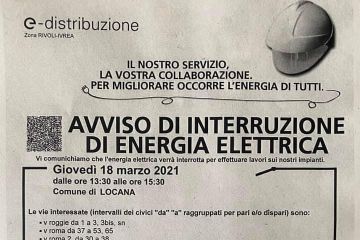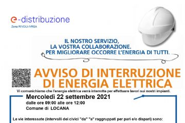 Si comunica che il giorno, Mercoledì 22 Settembre 2021, l'energia elettrica verrà interrotta per effettuare lavori dalle ore 9.00 alle ore 12.00
