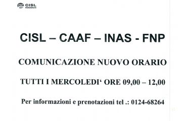 A partire da Mercoledì 10 Marzo 2021 presso il Comune di Locana (piano terra) sarà presente lo sportello della CISL dalle ore 9.00 alle ore 12.00 su prenotazione.