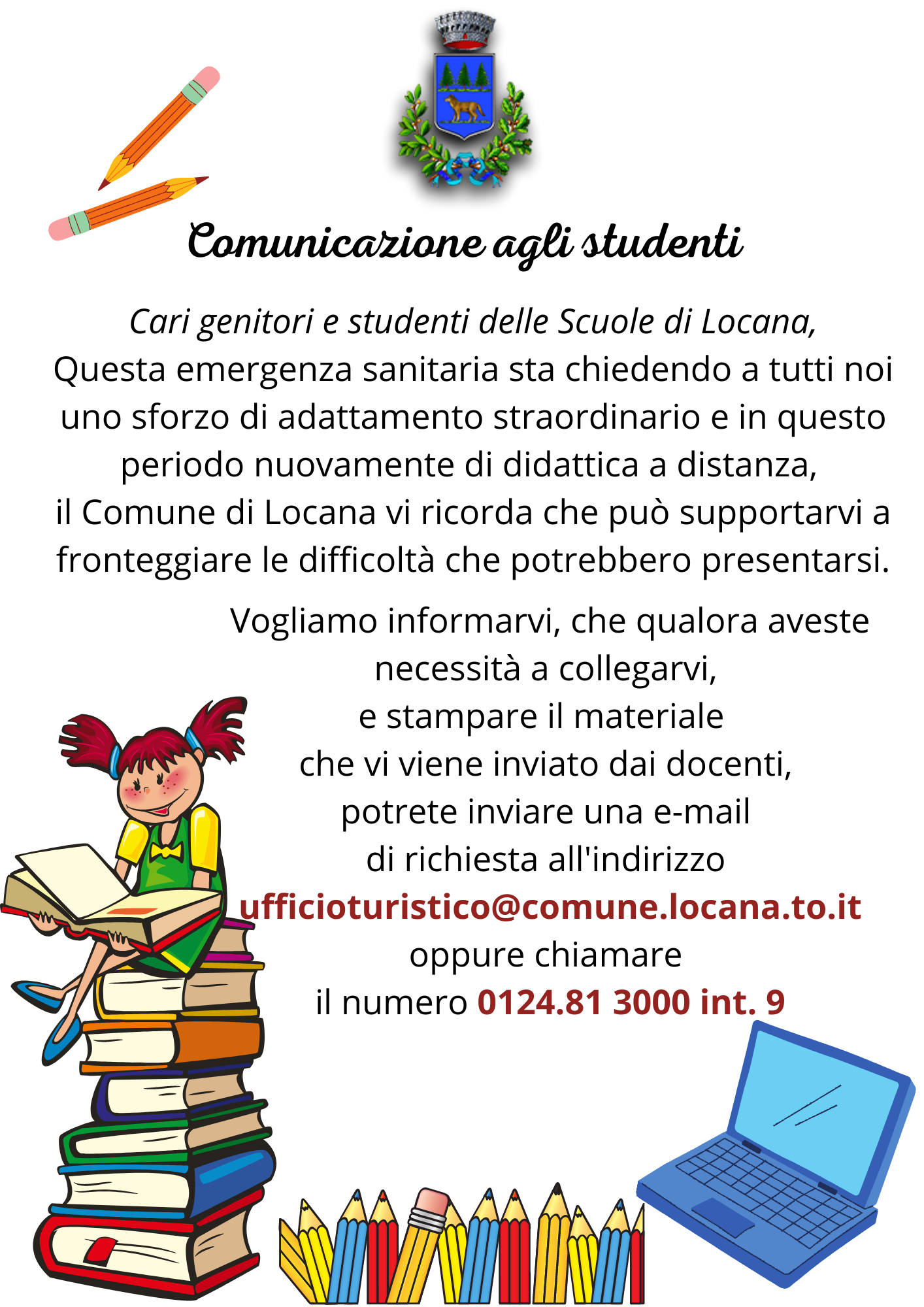 Questa emergenza sanitaria sta chiedendo a tutti noi uno sforzo di adattamento straordinario e in questo periodo nuovamente di didattica a distanza, il Comune di Locana vi ricorda che può supportarvi a fronteggiare le difficoltà che potrebbero presentarsi.