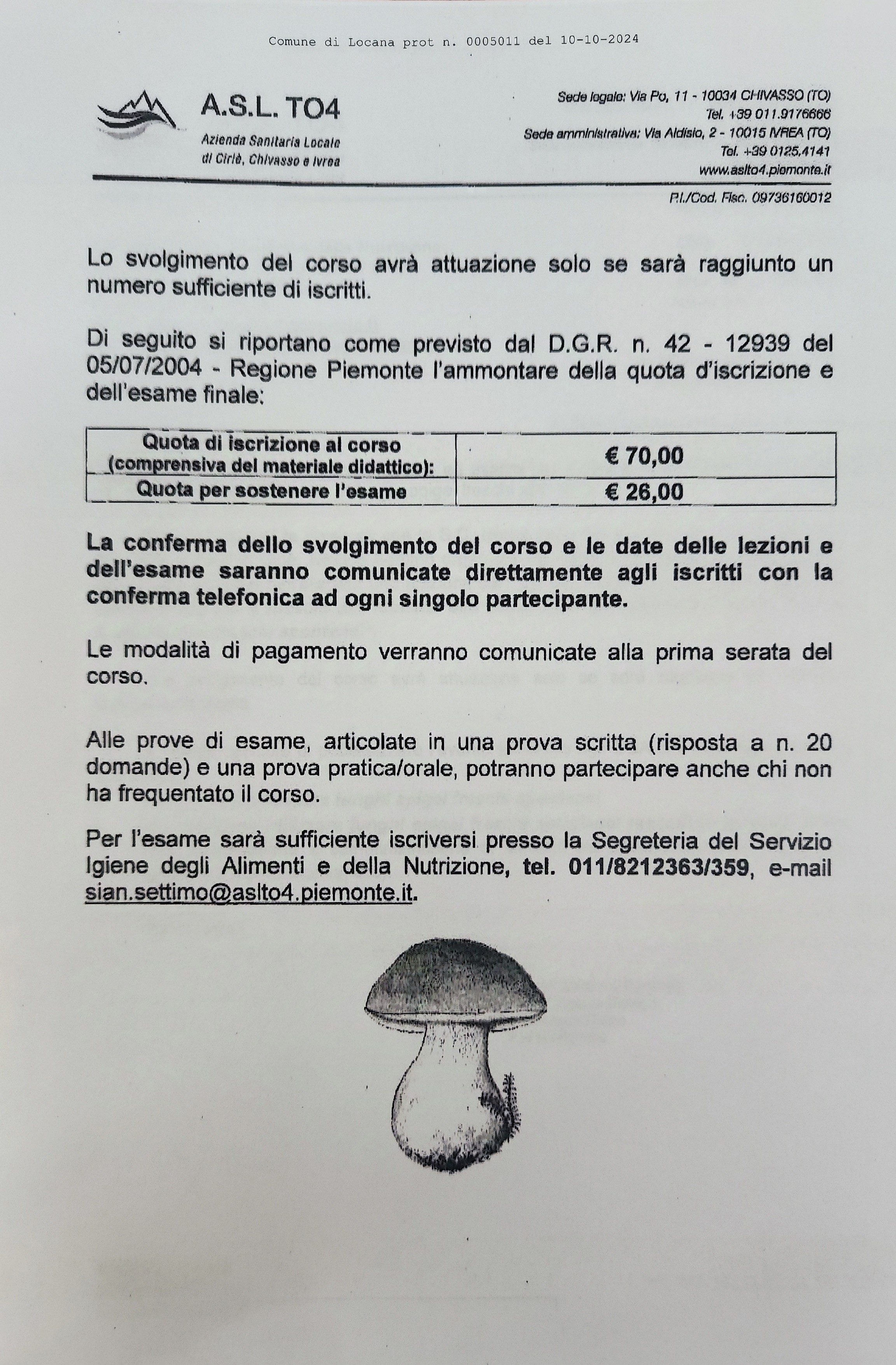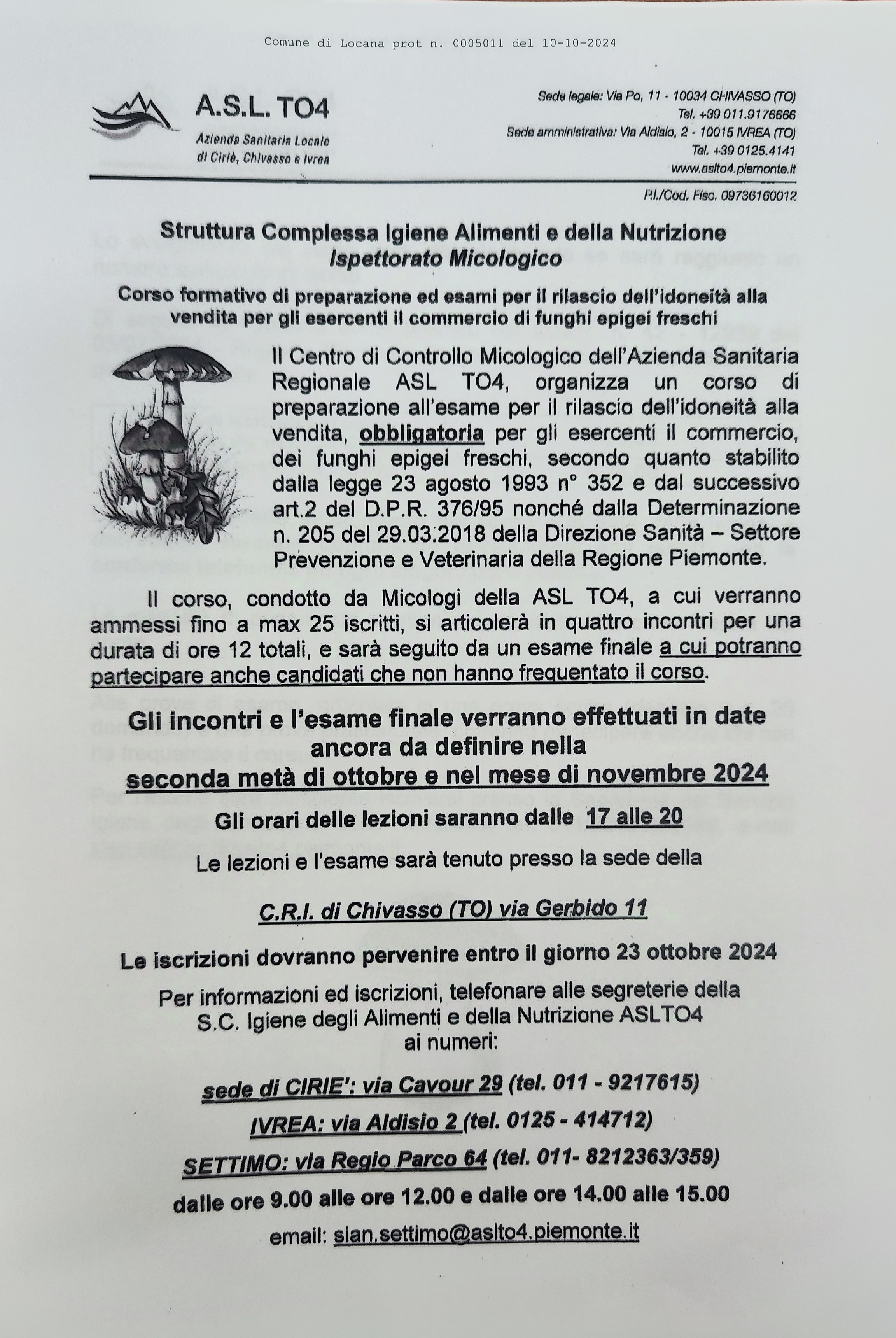 La S.C. Igiene degli Alimenti e della Nutrizione della ASL TO4 - Sedi di Ciriè, Ivrea e Settimo organizza nei mesi di Ottobre - Novembre 2024 una edizione del "Corso formativo di preparazione con esame finale per il rilascio dell'idoneità alla vendita per gli esercenti il commercio di funghi epigei freschi spontanei".