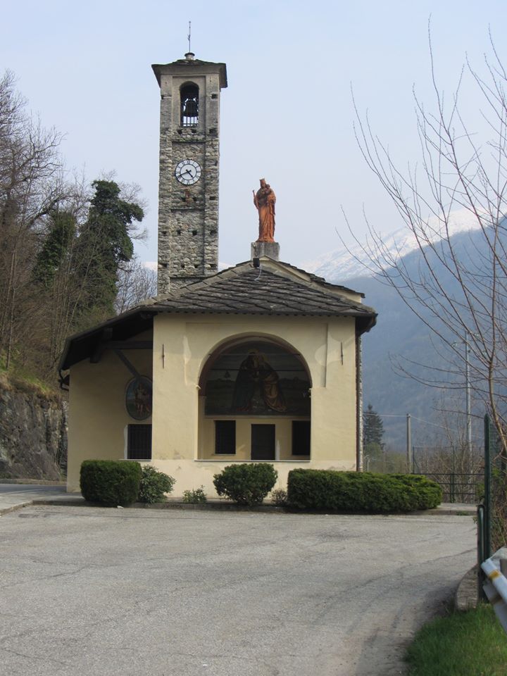 Lo sporto delle falde del tetto, prolungato sul fronte dell'edificio, forma un pronao a pianta quadrata che, oltre ad assicurare l'ingresso alla chiesa, protegge alcuni affreschi in facciata realizzati da Clemente Rovere nel 1847. La cella campanaria è inserita nell'impianto della chiesa e si presenta anch'essa in pietra a vista, conclusa in copertura da un tetto a 'lose' a capanna. Sulla copertura è posizionata un'interessante Madonna con Bambino realizzata con terracotta di Castellamonte.