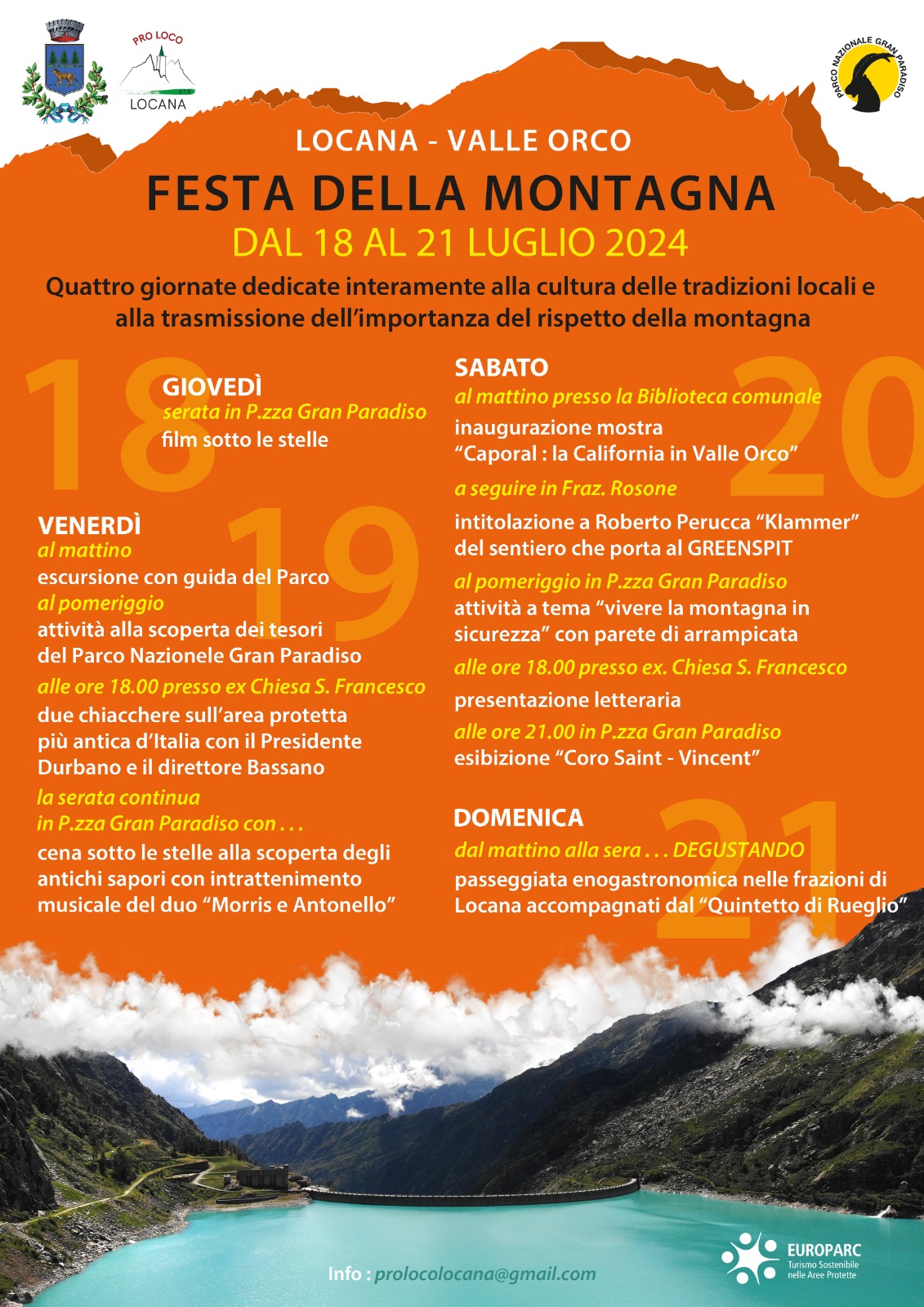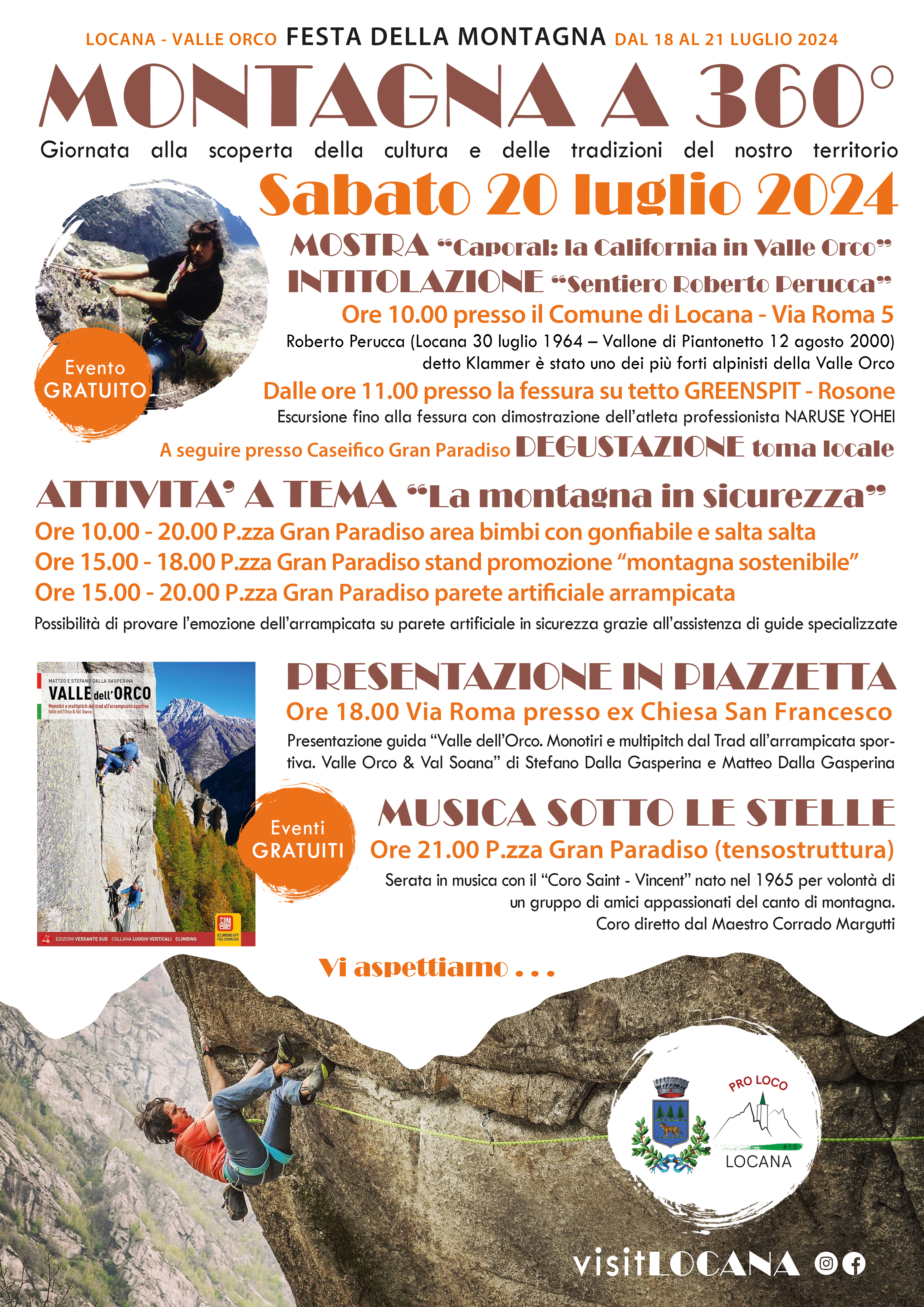 Al mattino inaugurazione mostra “Caporal: la California in Valle Orco” presso la biblioteca comunale. A seguire, in frazione Rosone, intitolazione a Roberto Perucca “Klammer” del sentiero che porta al Greenspit e degustazione alla scoperta degli antichi sapori.
