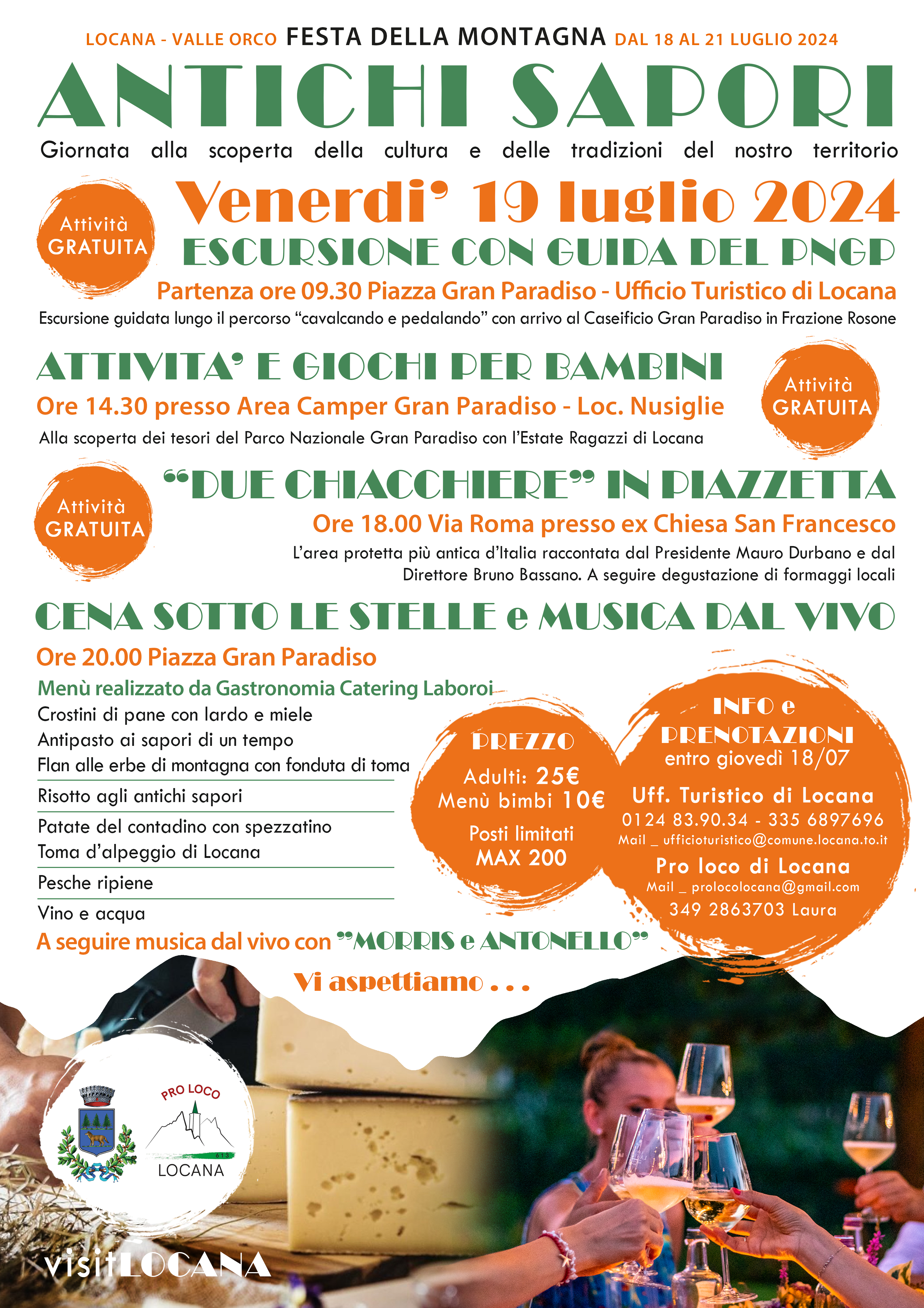Alle 20 cena sotto le stelle in piazza Gran Paradiso alla scoperta degli antichi sapori con intrattenimento musicale del duo “Morris e Antonello”.