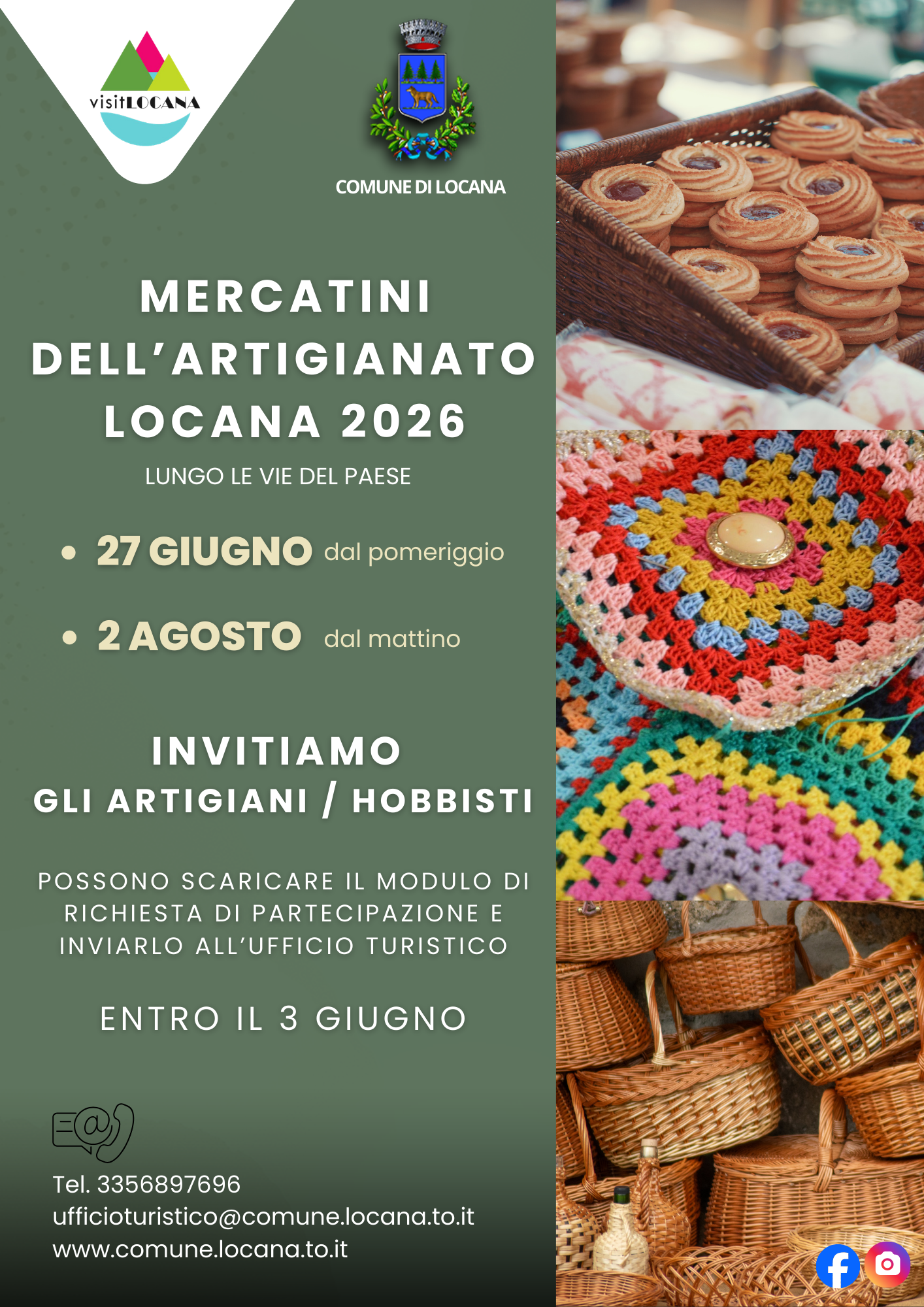 Mercatini dell'artigianato Locana 2026 Lungo le vie del Paese - 27 Giugno dal pomeriggio - 2 Agosto dal mattino Invitiamo gli artigiani / hobbisti Possono scaricare il modulo di richiesta di partecipazione e inviarlo all'Ufficio Turistico...